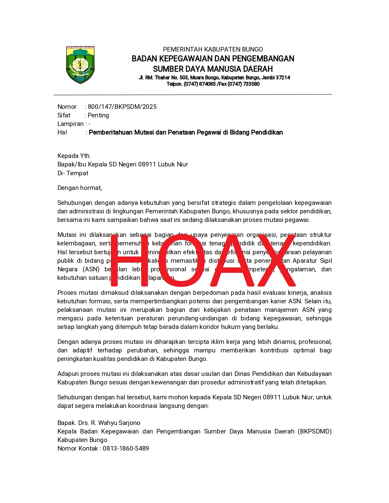 WASPADA PENIPUAN MENGATASNAMAKAN BKPSDMD KABUPATEN BUNGO
